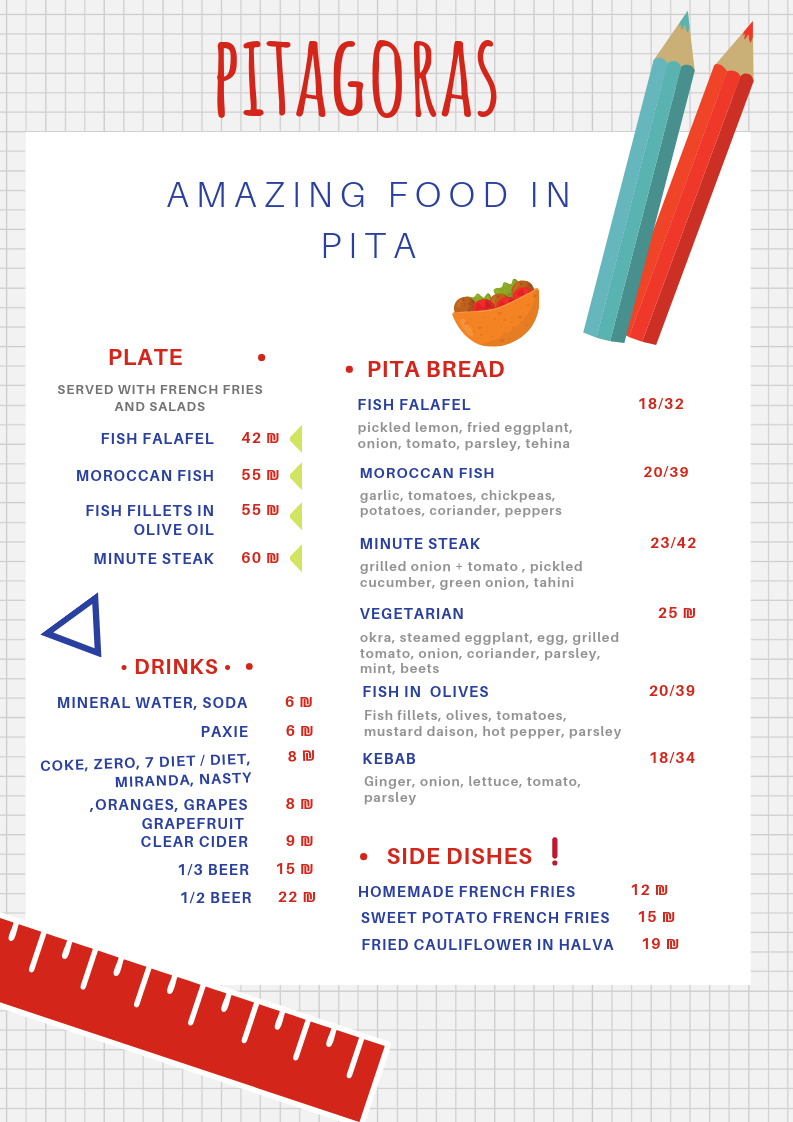 פיתגורס- פיתה עם מחשבה פיתות שף עם מגוון טעמים מיוחדים שיעיפו אתכם! כבר לא צריך לצאת מאילת כדי לאכול אוכל רחוב מושלם! פלאפל דג הראשון בארץ, מנה צמחונית, מינוט סטייק דג מרוקאי שקדי עגל ועוד דברים מפתיעים מחכים לכם בירה שליש מהחבית 12 שח בלבד בימי שישי מוגש דג מרוקאי בחלה•מטורףףףף•