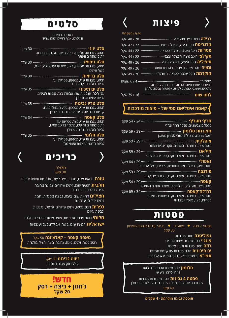 כל סוגי הפיצות, פסטות, זיוות, סלטים. משלוחים עד 5:00 בבוקר .. גם כשאתם במאנץ' ;)